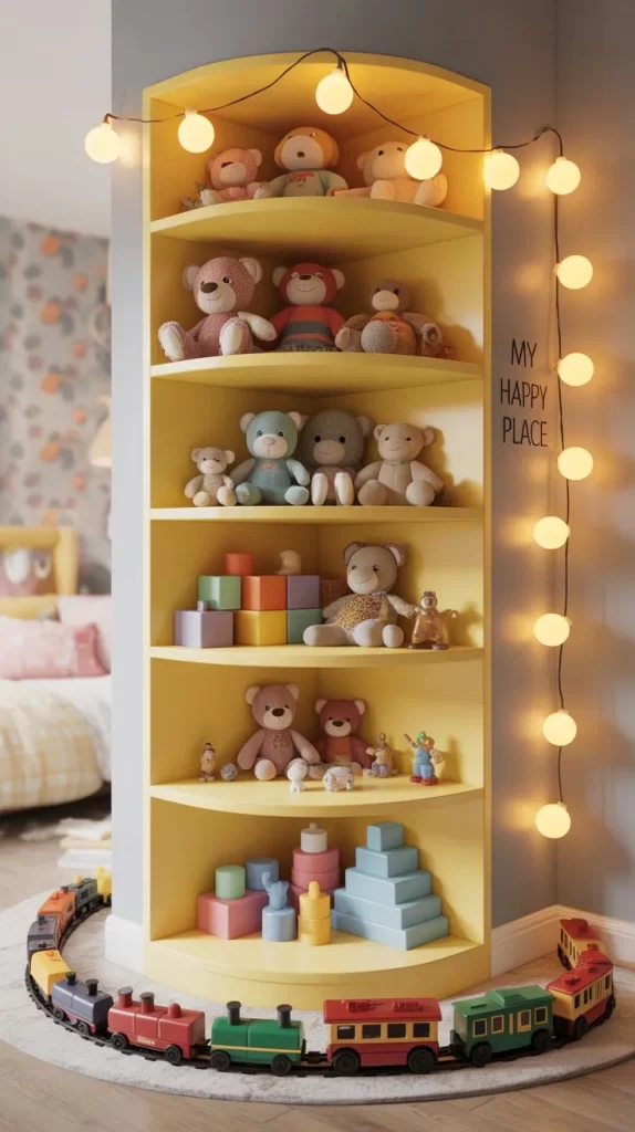 Use corner shelves specifically to showcase favorite toys or collectibles. Brightly paint the shelves to match the toy colors. This display not only keeps toys organized but also makes them part of the room’s decor, giving kids a sense of pride and excitement.
