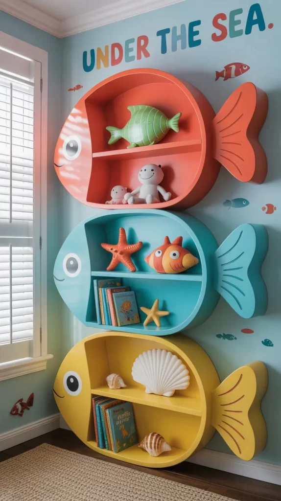Shelves shaped like fish, shells, or waves transform the corner into an ocean paradise. Perfect for storing toys, small aquariums, or ocean-themed decor. Use blues, aquas, and yellows to create a vibrant underwater look that sparks imagination.