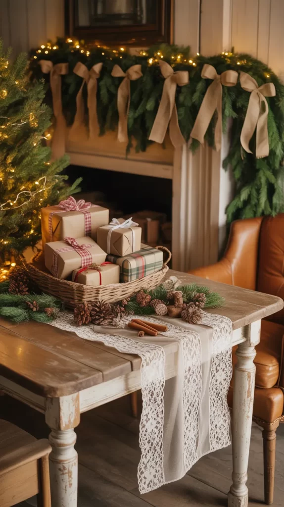 Burlap and lace add classic country charm to any Christmas decor. Wrap burlap ribbons around your tree, gifts, or table runners, and use lace as delicate accents.