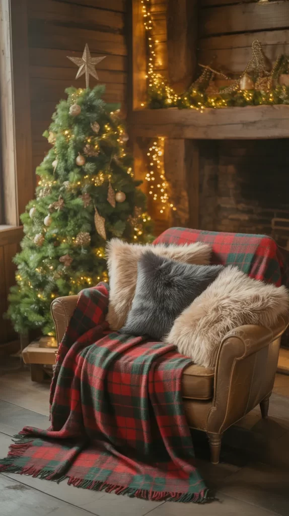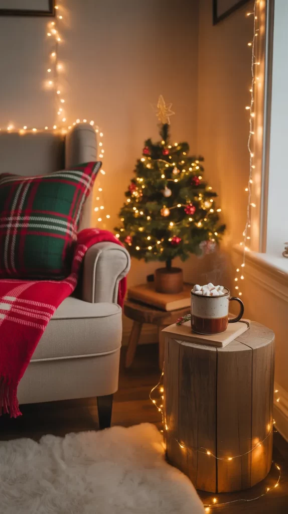 Transform a small corner into a cozy Christmas reading nook. Add a soft blanket, plaid pillows, and a small decorated tree nearby.