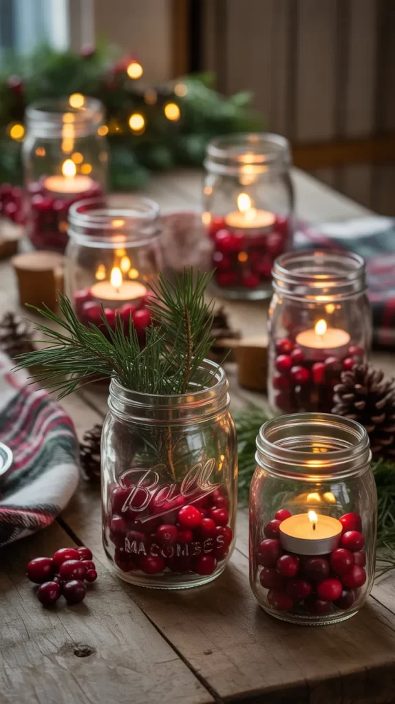Mason jars are an easy and affordable way to create magical lighting. Fill them with cranberries, pine branches, and small candles for a warm glow. You can place them on tables, windowsills, or even hang them using twine.