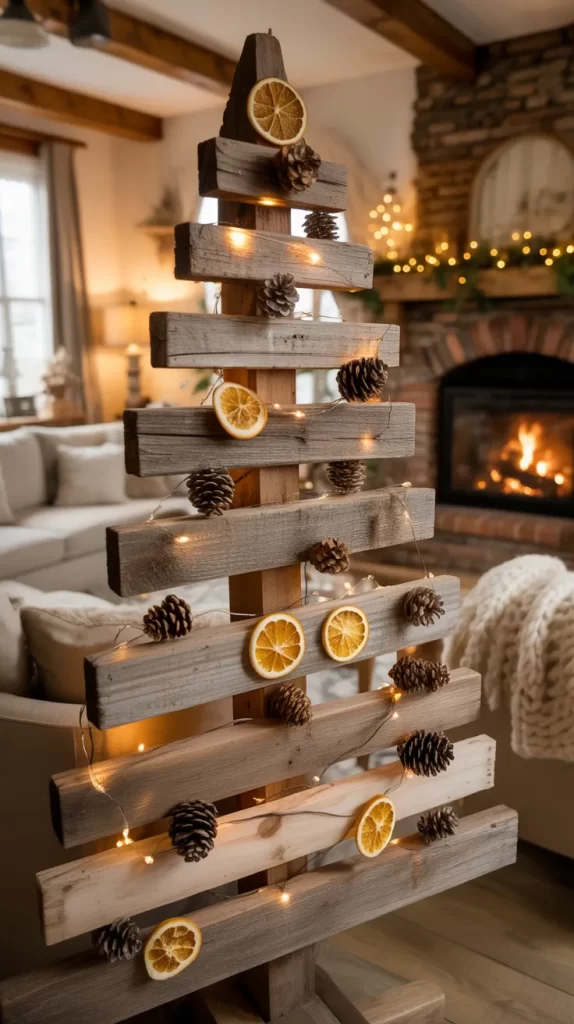 A rustic wooden Christmas tree is perfect for creating that handmade, countryside charm. You can use reclaimed wood or branches to build a wall-mounted or freestanding tree. Add small string lights, pinecones, and dried orange slices for decoration. This eco-friendly idea brings nature indoors while saving space.