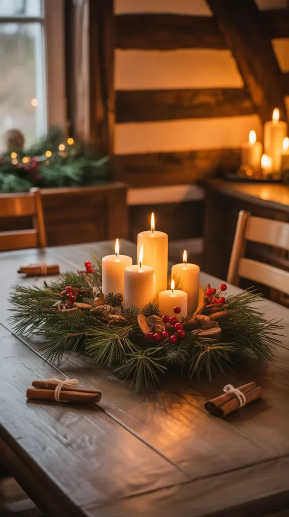 Create a warm and glowing centerpiece using candles of different sizes placed on a wooden tray. Add pine branches, cinnamon sticks, and dried fruit for texture and fragrance.