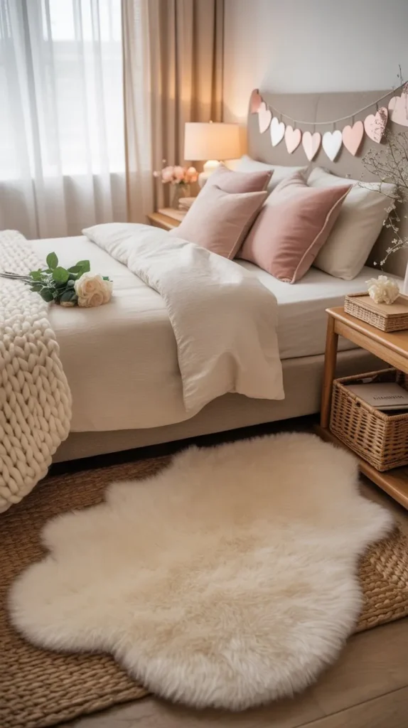 Choose a medium-sized rug placed beside or under the bed to maximize impact. Neutral or soft pink tones work well for Valentine’s Day and stay stylish afterward. This is a smart purchase because a good rug lasts for years, making it a value-for-money décor upgrade that improves comfort every day.