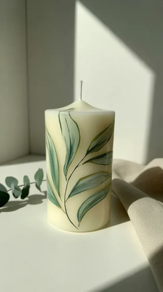 Botanical leaf designs are a popular trend in modern home decoration. Painting eucalyptus leaves, fern shapes, or small greenery patterns on candles creates a calm and natural style.