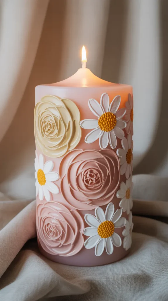 Floral designs are one of the most popular candle painting ideas for home decor. Simple flowers like daisies, roses, or lavender painted on pillar candles create a soft and elegant decoration. You can use pastel colors for a calm aesthetic or bright colors for a cheerful room accent.