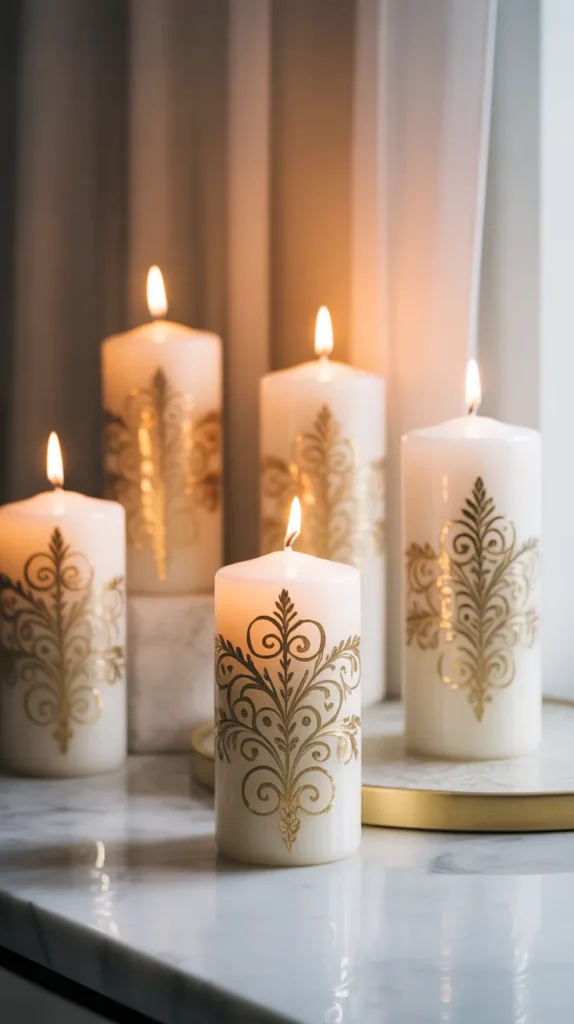 Gold accent candles look luxurious and elegant while still being easy to create. Thin gold lines, dots, or leaf patterns painted on white or black candles add a sophisticated touch to home decor.