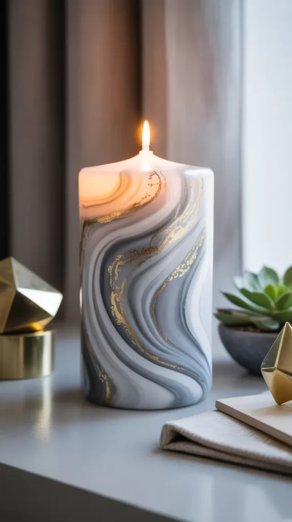 Marble-style candles mimic the look of real marble stone with swirling paint patterns. Soft gray, white, and gold tones create a modern decorative effect.
