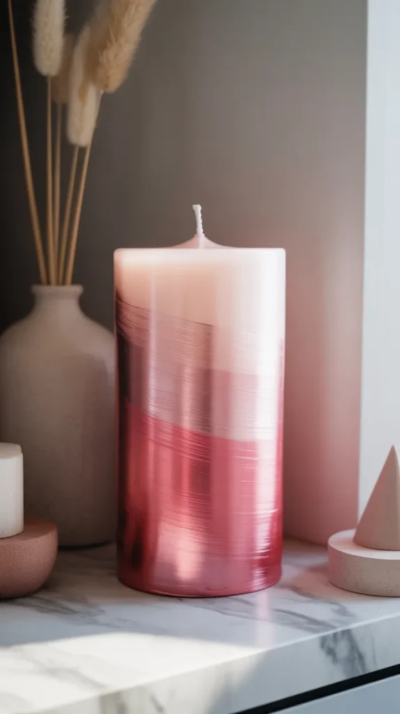 Ombre candles feature a gradient color effect where one color slowly blends into another. Soft shades like pink to white, blue to lavender, or peach to cream create beautiful decorative candles.
