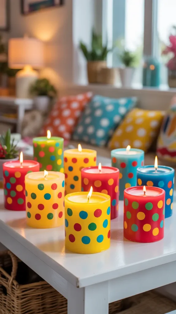 Polka dot candles are playful and easy to make. Bright dots in different sizes can create a cheerful decorative accent for living rooms or party tables.