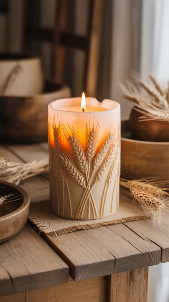 Rustic farmhouse candles use neutral colors, simple stripes, or wheat designs to match farmhouse decor. Beige, brown, and white colors help create a cozy and natural look.