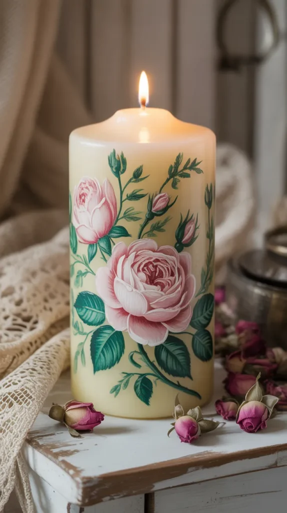Vintage rose candle painting gives candles a romantic and classic appearance. Soft pink roses with green leaves painted on cream-colored candles create a timeless decoration that works beautifully in living rooms or dining tables.