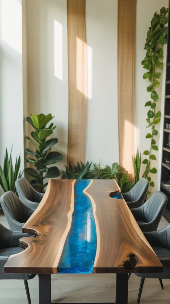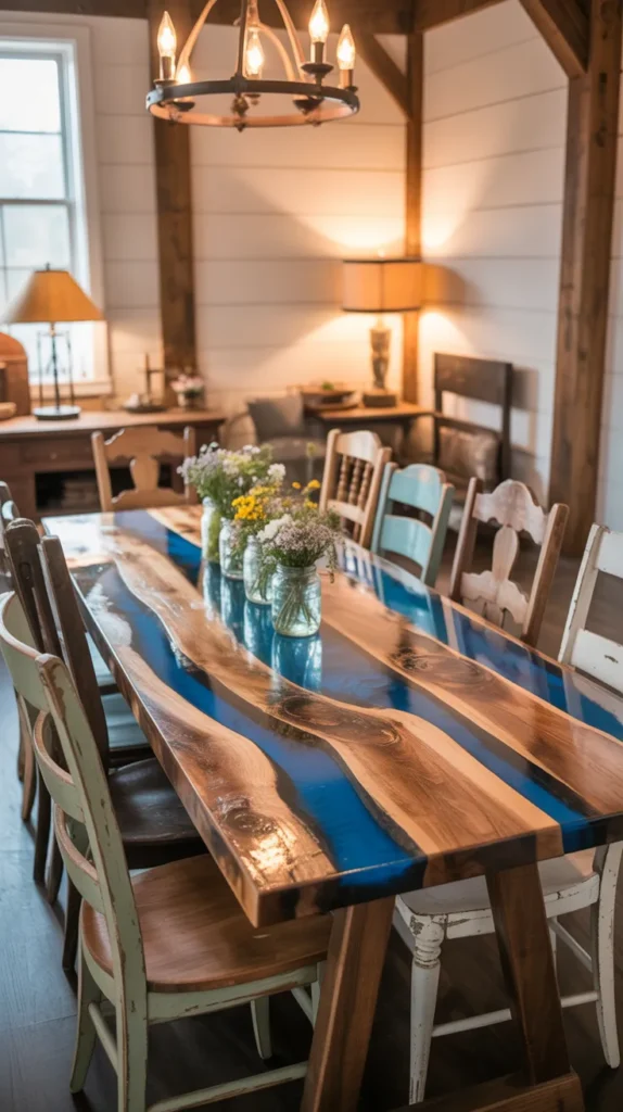 A blue river epoxy dining table is one of the most searched epoxy resin table designs for stylish interiors. It uses a live-edge wood slab with bright blue resin flowing through the center like water. This creates a calm and natural look that fits farmhouse, modern, and luxury homes. It works well in open dining spaces where the table becomes the main feature.