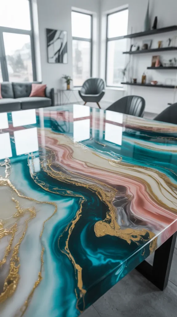 A color splash artistic epoxy table uses bright pigments, swirls, and layered designs. It is perfect for creative homes, studios, or anyone who loves bold decor. Popular colors include teal, gold, pink, and white.