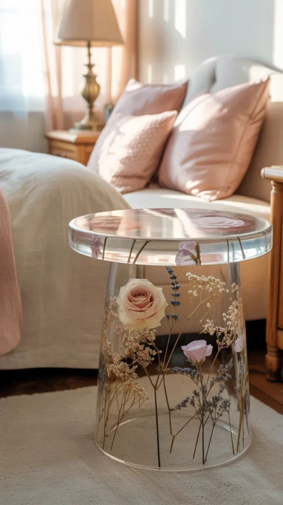 A floral embedded resin table includes dried flowers sealed inside clear epoxy. This creates a soft and elegant look that works well in bedrooms, reading nooks, and feminine interiors. Popular flower choices include roses, lavender, and wildflowers.