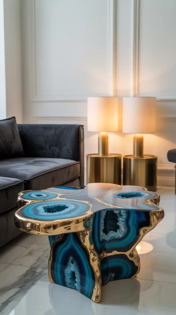 A geode inspired epoxy accent table uses crystal-like patterns and metallic colors. Purple, blue, silver, or gold shades create the look of a natural gemstone. This trendy design works as a statement piece in living rooms, bedrooms, or boutique spaces.