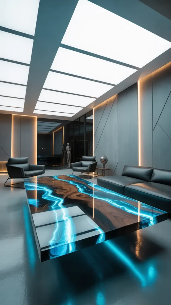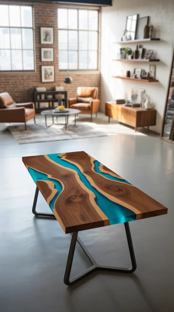An industrial metal base epoxy table mixes wood, steel, and resin for a bold urban look. It fits loft apartments, studios, and modern homes with exposed brick or concrete walls. Black metal legs add strength and contrast.