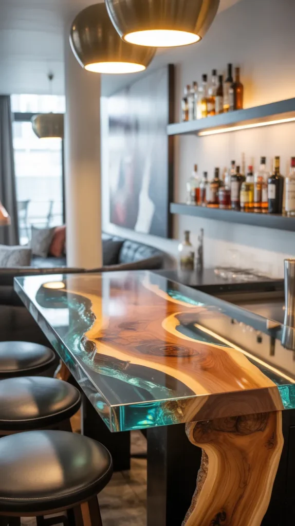 A live edge epoxy bar table is great for entertainment spaces, kitchens, or basement lounges. The natural wood edge keeps the table organic, while the resin center adds a sleek modern finish. It pairs well with bar stools and pendant lights.