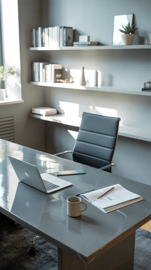A minimalist gray epoxy work table fits clean and modern interiors. Soft gray tones match black, white, and wood furniture easily. This makes it useful for offices, studios, and multi-use rooms. The simple design helps the room feel organized and calm.