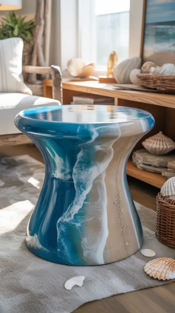 An ocean wave epoxy side table brings beach-inspired style into your home. Blue, white, and sandy tones are layered to look like real waves hitting the shore. It is ideal beside a sofa, reading chair, or bedroom bed. This table adds color without taking too much space.