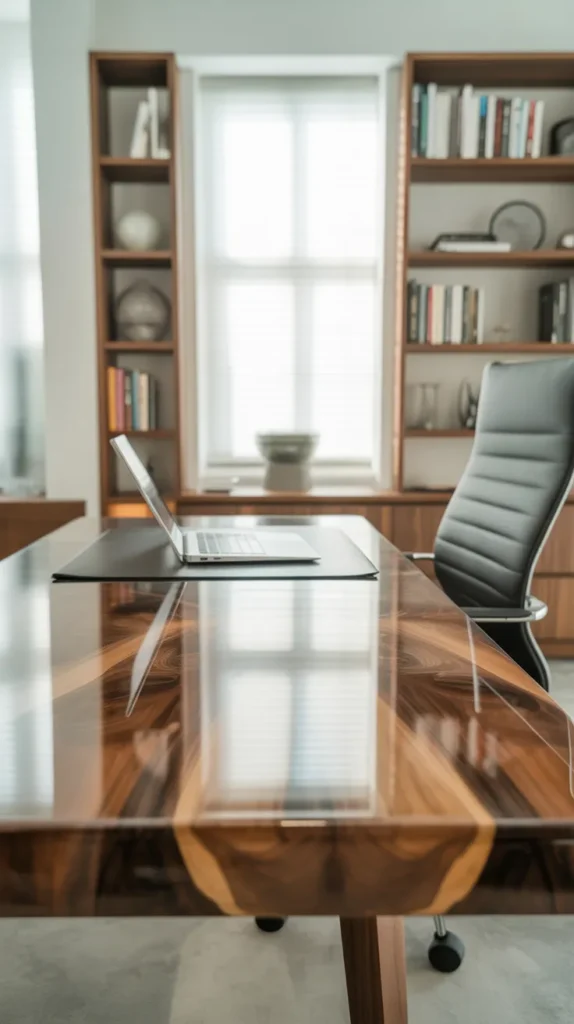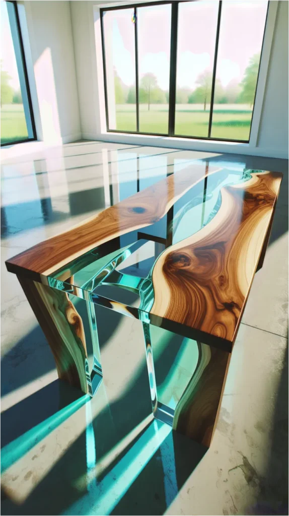 A walnut wood and clear resin desk is perfect for a home office or study corner. The clear epoxy keeps the natural beauty of the wood visible while giving a smooth and polished finish. It feels warm, professional, and creative at the same time. This table design suits remote workers, students, and content creators.