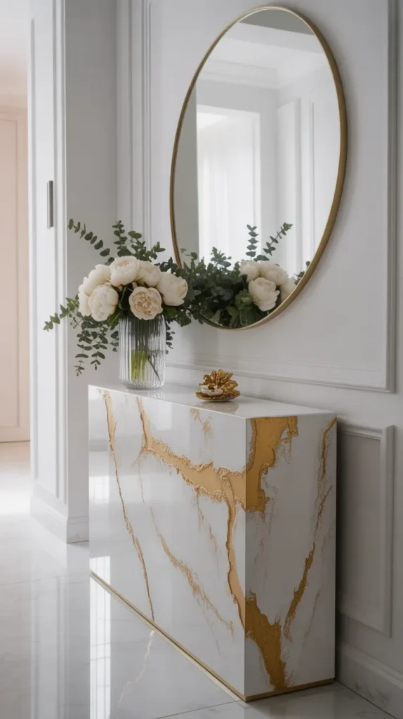 A white and gold epoxy console table looks bright, clean, and elegant. It is often placed in entryways, hallways, or behind sofas. The white resin surface keeps the room feeling open, while gold accents add a luxury touch. It works well in glam, modern, or contemporary homes.