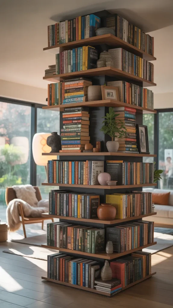 A tall corner bookshelf tower uses vertical space effectively. It’s ideal for book lovers who want storage without large bookcases.
