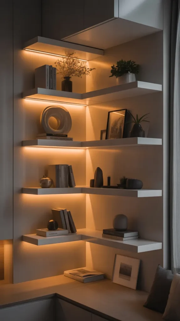 Adding LED lighting under corner shelves enhances the modern look and highlights decorative items. This design works well in living rooms and bedrooms.