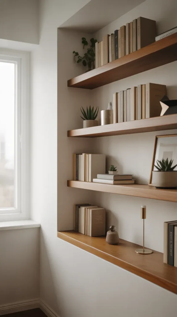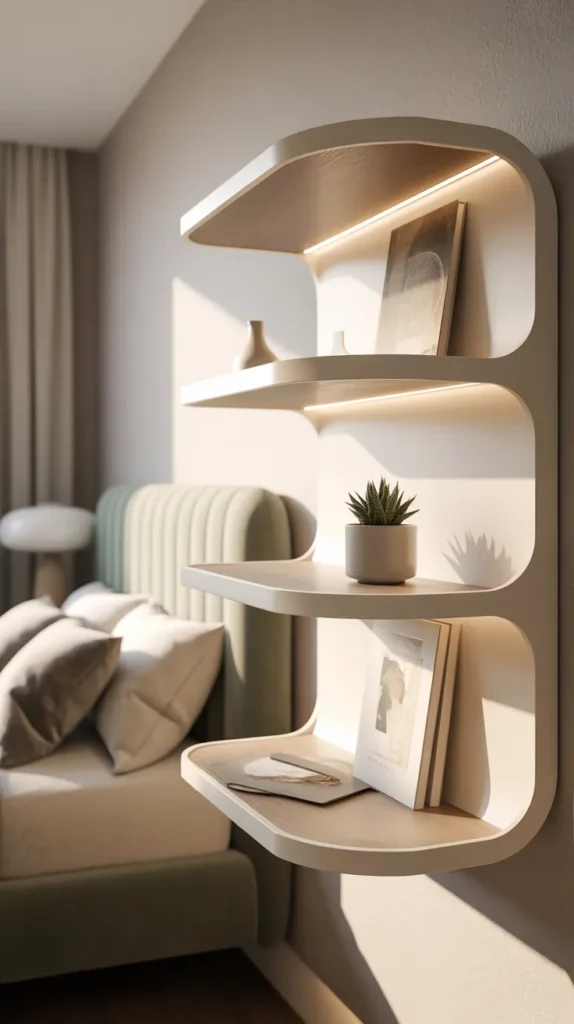 Curved corner shelves soften sharp angles and create a smooth, modern look. They work well in bedrooms and reading corners.