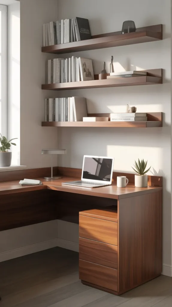 Combine a floating desk with upper corner shelves for a compact workspace. This is perfect for small apartments or home offices.