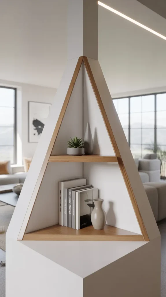 Geometric corner shelves add a bold, modern statement to empty corners. Triangular, hexagon, or zigzag shelf patterns instantly create visual interest while still offering storage space for small decor pieces.