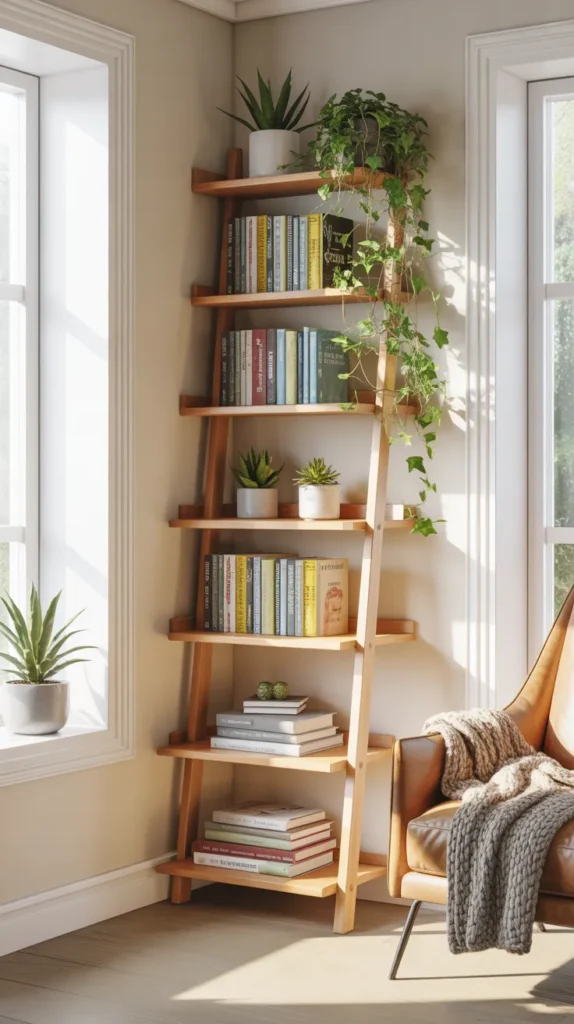 A ladder-style corner shelf leans into the corner and offers multiple levels for storage and display. Its vertical design is perfect for small rooms needing extra storage.
