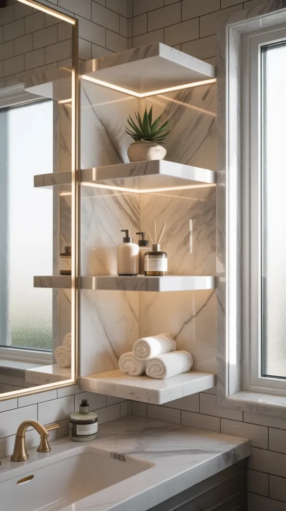 Marble-look corner shelves add elegance to modern spaces. Use them in bathrooms or living rooms for a luxury feel.