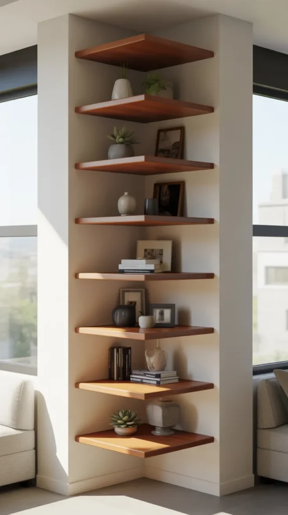 Minimal floating wood corner shelves are a timeless modern choice. Clean lines and natural finishes create a simple, elegant look that works in living rooms, bedrooms, or home offices. Stacking two or three shelves vertically helps you maximize wall height without taking up floor space.