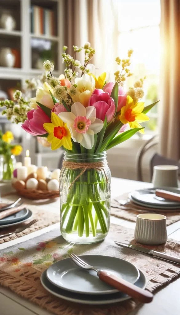 • Choose a mason jar (or any jar you have available) and fill it with fresh flowers, such as tulips, daffodils, or daisies.