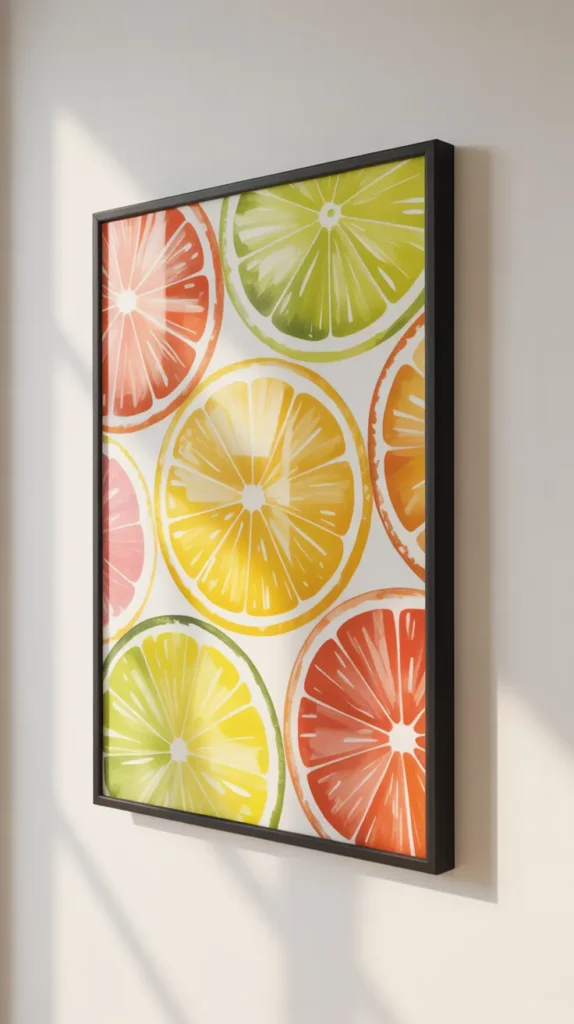 Citrus slice wall art using paper or painted wood adds a fresh and vibrant look. Designs like oranges, lemons, and limes bring a summer feel into your home.