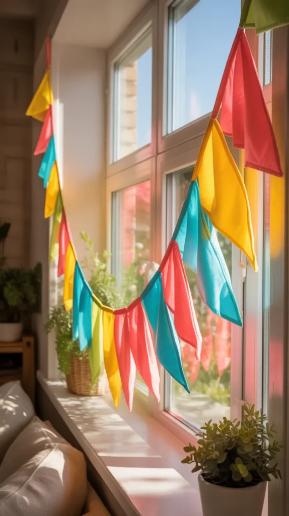 A fabric garland made from bright scraps can add a festive look to your home. Tie small strips of fabric onto a string to create a colorful banner that works well for windows or walls.