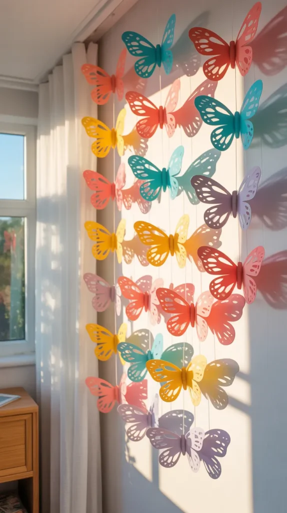 Butterfly wall hangings made from paper or fabric create a light and playful atmosphere. Arrange them in patterns for a dynamic effect.
