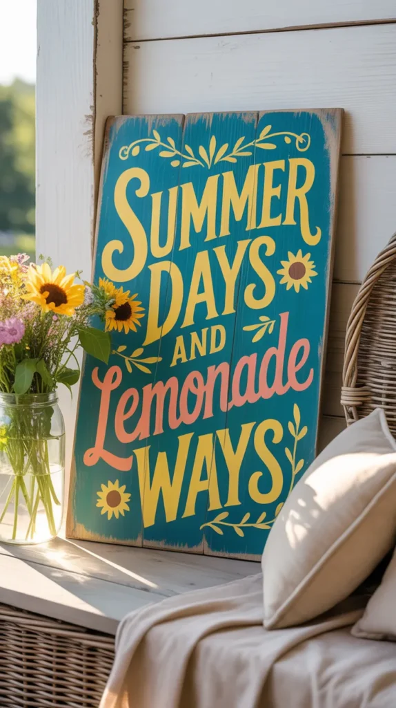Wooden signs with summer quotes or designs are a fun way to decorate your walls. Use bright paints and simple lettering to create a welcoming feel.