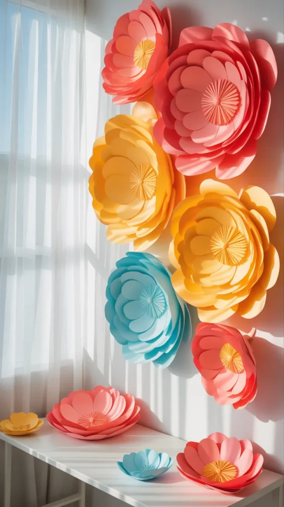 Paper flower wall decor adds a soft and vibrant touch to any room. You can create large flowers using colored paper or cardstock and arrange them on a wall for a bold statement. This idea is perfect for living rooms or bedrooms.