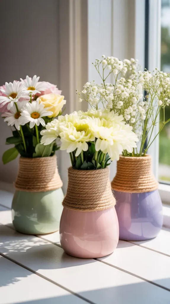 Wrap glass or plastic bottles with rope and paint them in summer colors. These vases add texture and charm to your decor.