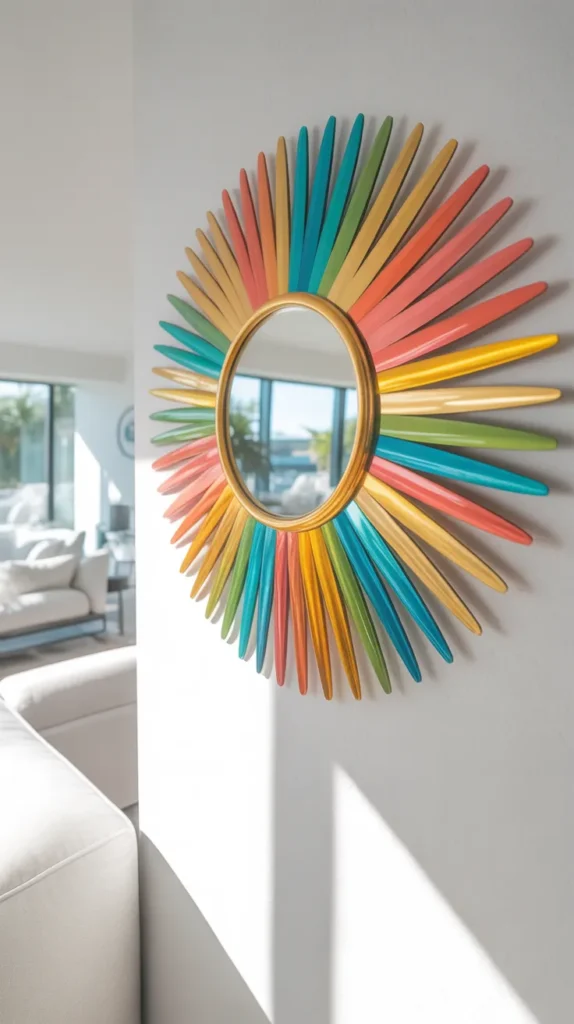 Create a sunburst mirror frame using wooden sticks or straws painted in gold or bright colors. This adds a bold and stylish focal point to your wall.