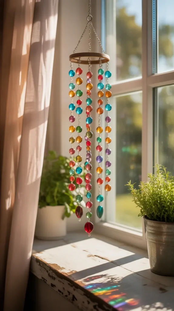 Beaded wind chimes create soft sounds and add color to your space. Use beads in different shapes and colors to design your own pattern.