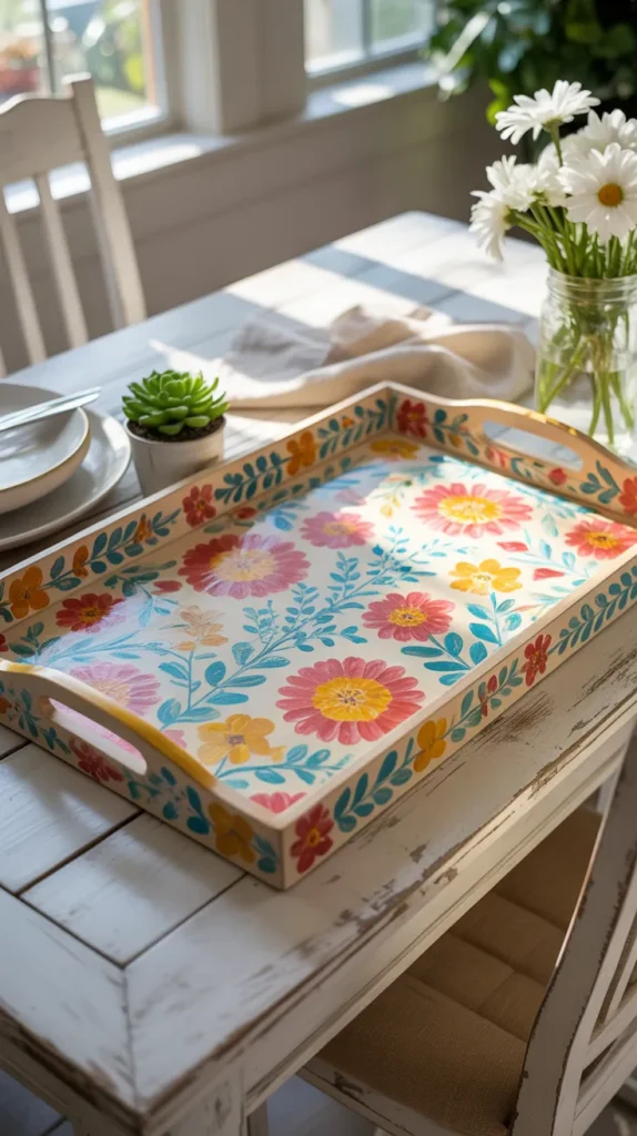 A painted wooden tray can be used as a centerpiece or serving tray. Add patterns or bright colors for a summer-inspired look.