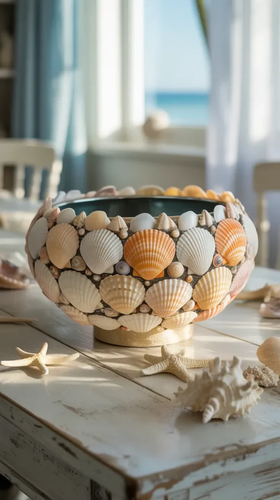 Seashell decorative bowls bring a coastal summer vibe into your home. Collect shells from the beach or buy them and glue them around a simple bowl to create a unique centerpiece.