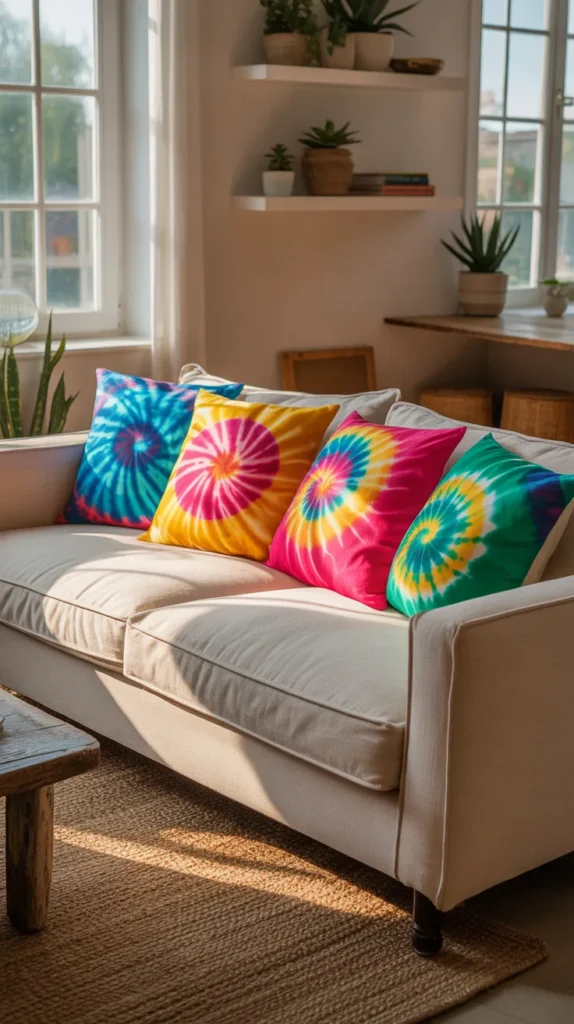 Tie-dye cushion covers bring fun patterns and bright colors to your seating area. You can create unique designs using simple dye techniques.