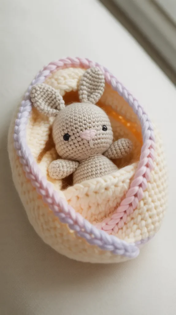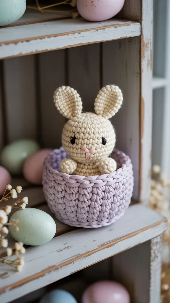 This design shows a tiny bunny sitting inside a small crochet basket. It looks detailed but can be made using basic shapes. It’s perfect for shelf decor or Easter trees and feels premium without being expensive.