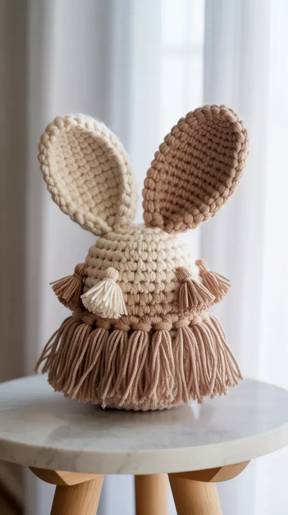 Boho bunny ornaments feature fringe tails, tassels, or textured yarn details. They fit modern bohemian homes and Pinterest-style decor. Neutral colors keep costs low while adding trendy texture.
