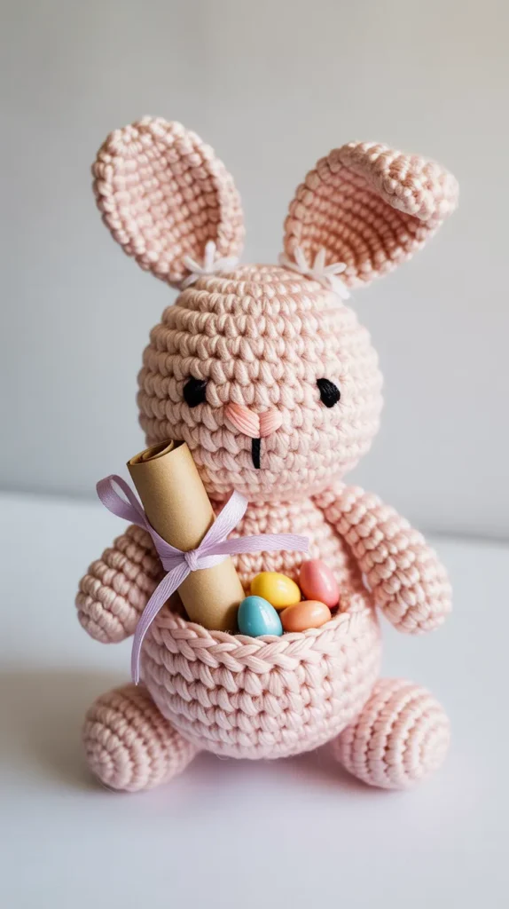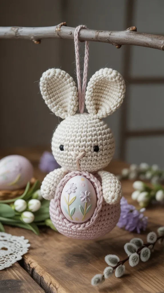 This ornament holds a small chocolate or decorative egg inside a crochet bunny frame. It works well for Easter trees or gift baskets and combines decor with treats, helping save money on separate gifts.