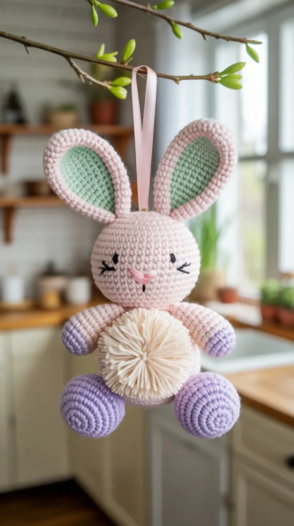 Classic pastel bunny ornaments are also a cost-effective way to refresh your spring decor. You can make several with leftover yarn, keeping your project affordable and practical. These ornaments blend easily with farmhouse and modern homes, making them a smart seasonal decorating choice.